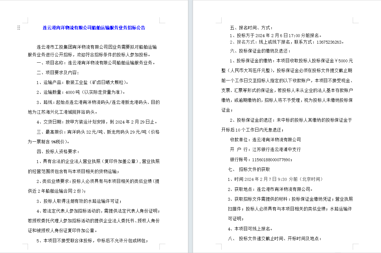 連云港宵洋物流有限公司船舶運輸服務(wù)業(yè)務(wù)招標(biāo)公告