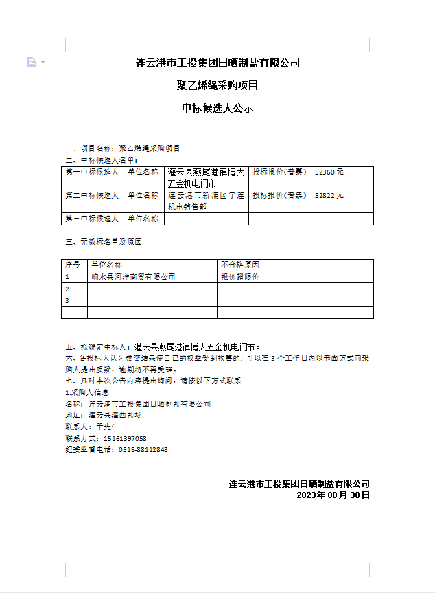 連云港市工投集團日曬制鹽有限公司聚乙烯繩采購項目中標(biāo)候選人公示