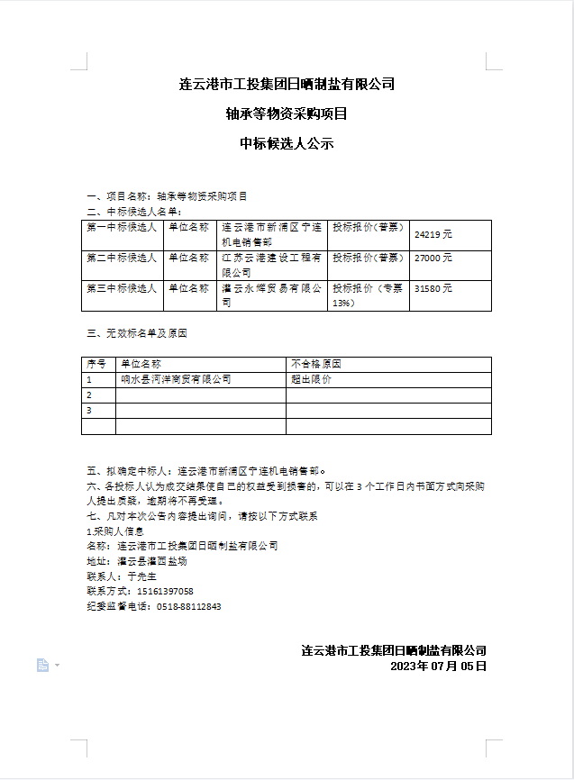 連云港市工投集團(tuán)日曬制鹽有限公司軸承等物資采購項目中標(biāo)候選人公示