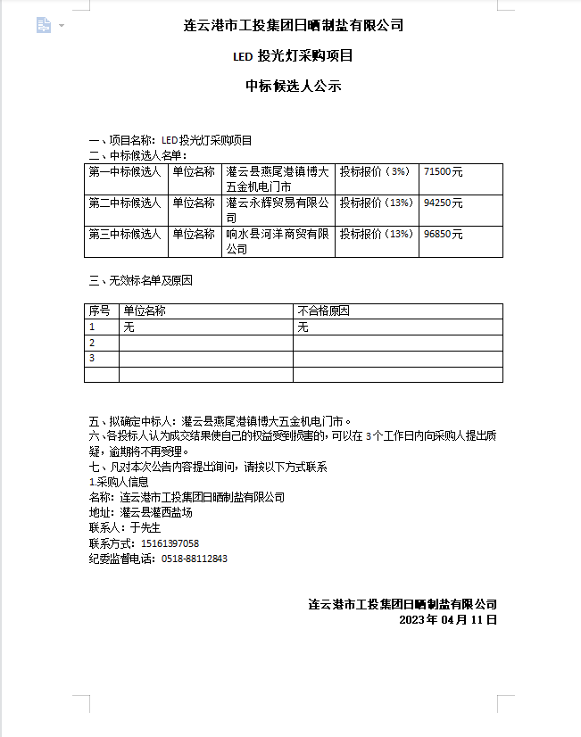 連云港市工投集團(tuán)日曬制鹽有限公司LED投光燈采購項目中標(biāo)候選人公示