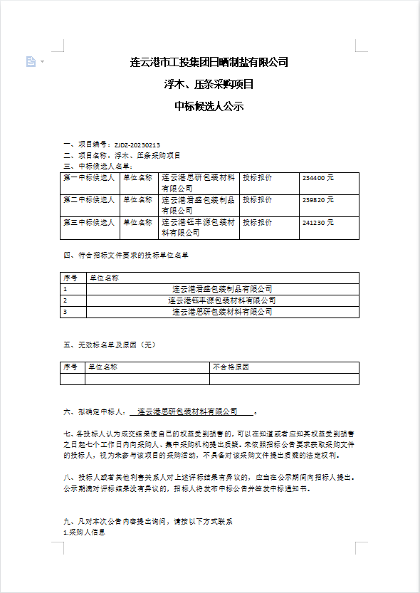 連云港市工投集團(tuán)日曬制鹽有限公司浮木、壓條采購項(xiàng)目中標(biāo)候選人公示