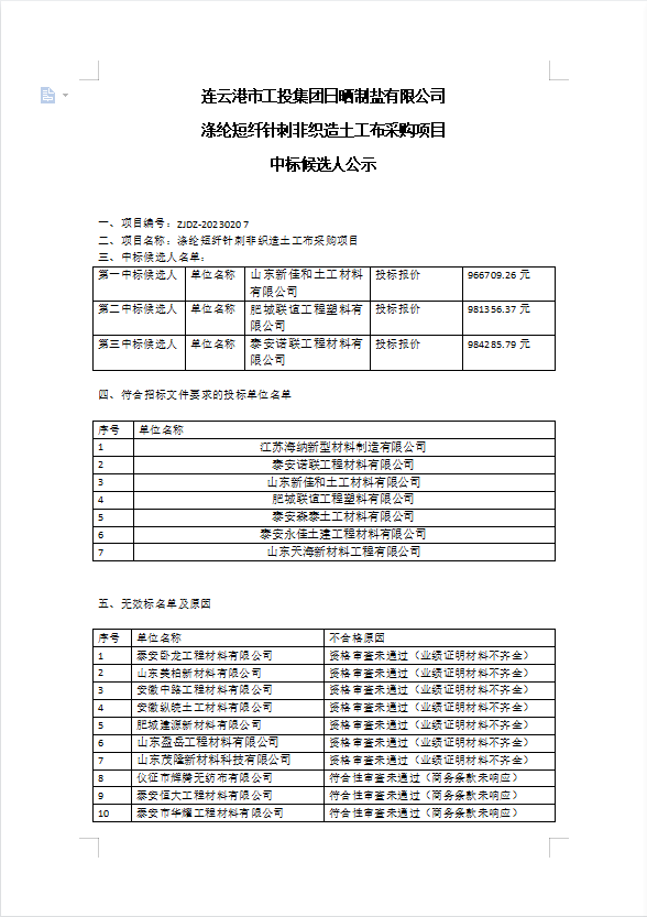 連云港市工投集團(tuán)日曬制鹽有限公司滌綸短纖針刺非織造土工布采購項(xiàng)目中標(biāo)候選人公示