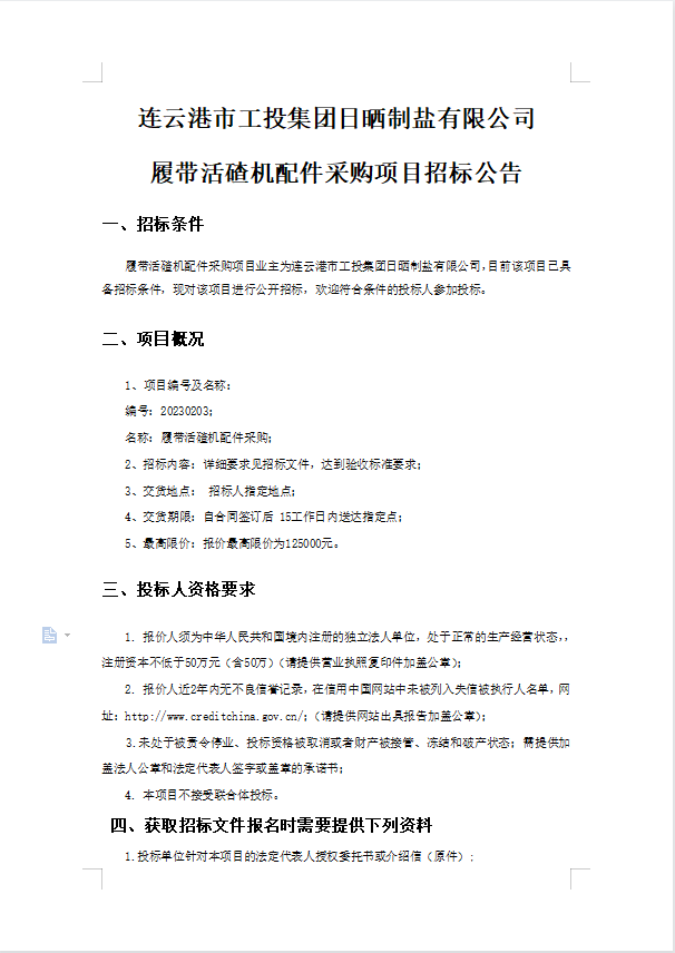 連云港市工投集團(tuán)日曬制鹽有限公司履帶活碴機(jī)配件采購項(xiàng)目招標(biāo)公告