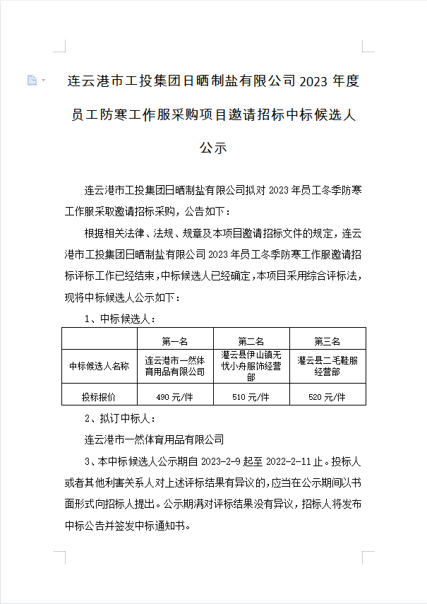 連云港市工投集團(tuán)日曬制鹽有限公司2023年度員工防寒工作服采購項(xiàng)目邀請招標(biāo)中標(biāo)候選人公示