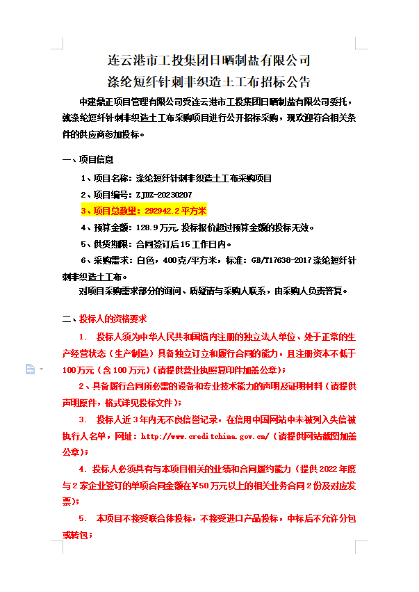 連云港市工投集團日曬制鹽有限公司滌綸短纖針刺非織造土工布招標(biāo)公告