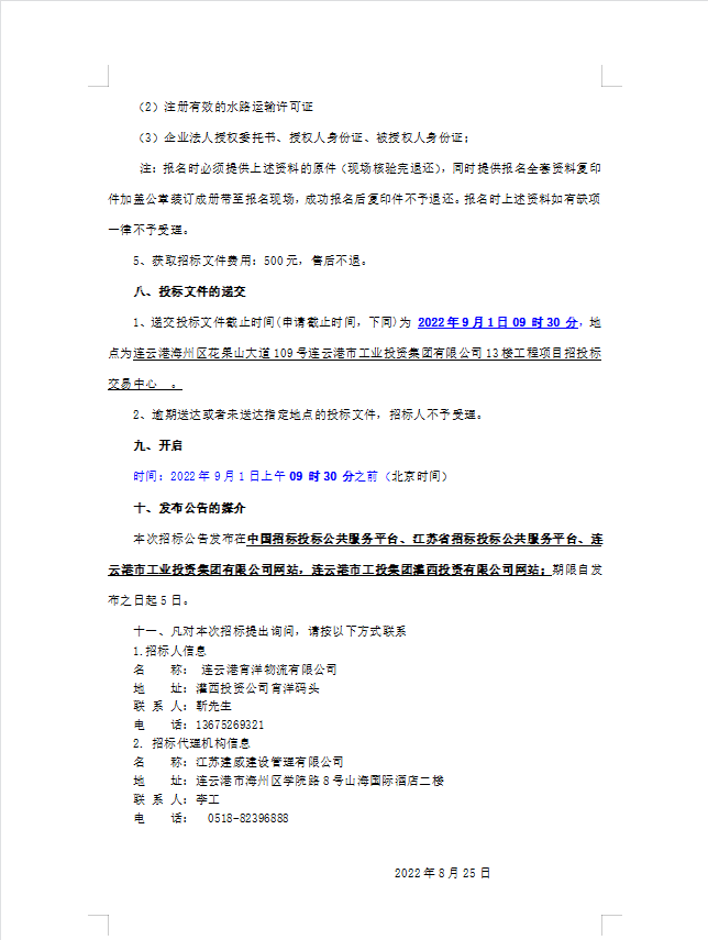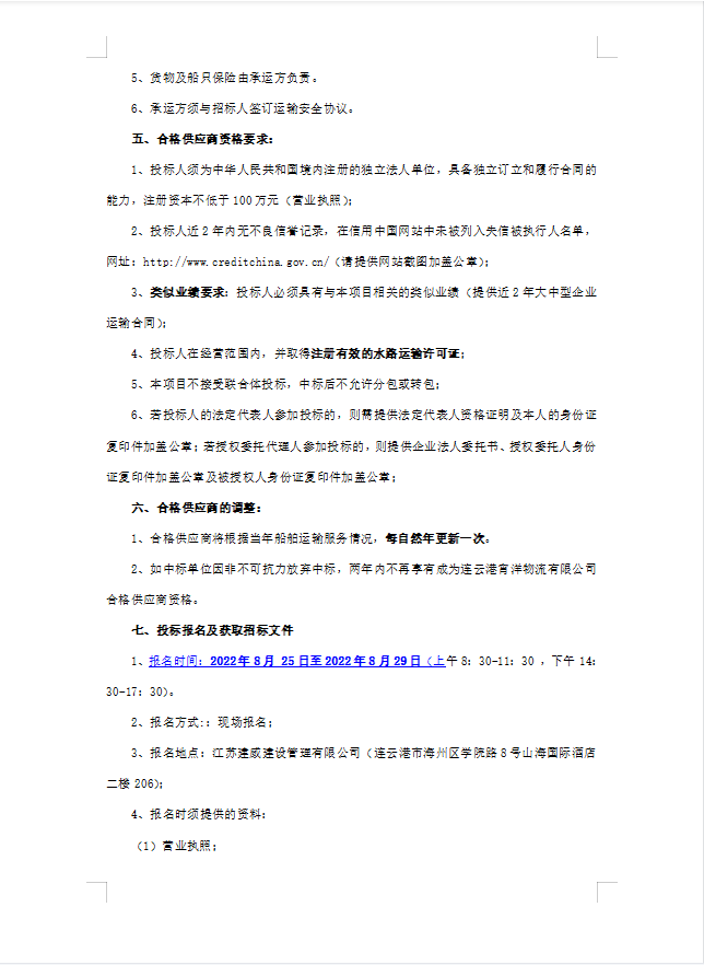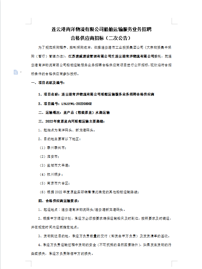 連云港宵洋物流有限公司船舶運輸服務業(yè)務招聘合格供應商招標(二次公告)