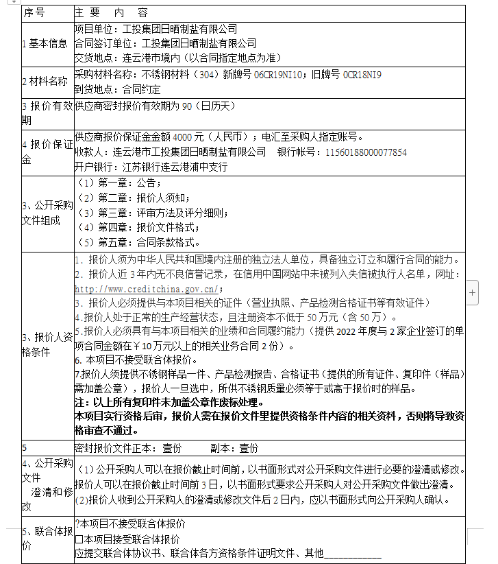 報價保證金接收人:連云港市工投集團(tuán)日曬制鹽有限公司。