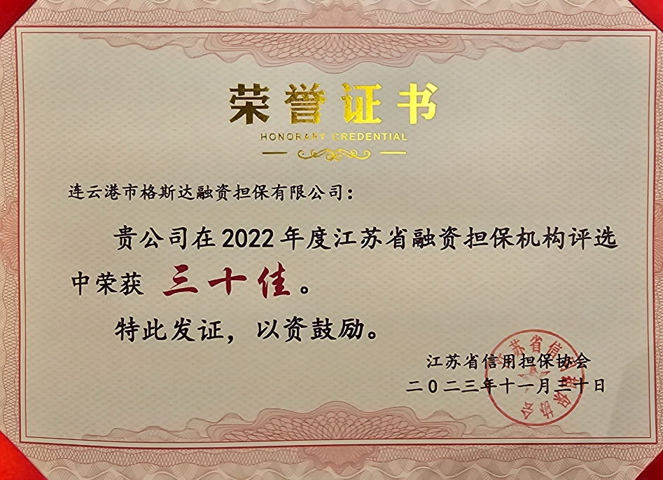 ??3月23日,江蘇省信用擔保協(xié)會在南京召開會議。連云港市格斯達融資擔保有限公司被授予“江蘇省2022年度融資擔保機構三十佳”榮譽。本次全省共有71家融資擔保機構參加評選,格斯達擔保公司成功入選。