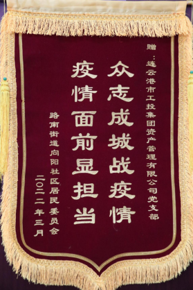 “非常感謝你們對我們社區(qū)的守護(hù),為我們居民筑牢了疫情‘防護(hù)墻’,你們辛苦了!”5月16日下午,路南街道向陽社區(qū)居委會書記王婷一行,專程來到資產(chǎn)公司送來一面印有“眾志成城戰(zhàn)疫情,疫情面前顯擔(dān)當(dāng)”的錦旗,代表社區(qū)居民向資產(chǎn)公司黨支部在今年疫情期間援助向陽社區(qū)中所作貢獻(xiàn)表示敬意和感謝。