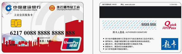 工會會員服務卡是一張集工會會員身份識別功能、會員服務功能于一體的工會會員實名服務卡。具體功能如下: (一)身份識別功能。工會會員服務卡具有工會會員身份識別功能,記載工會會員基本信息,全市工會會員實名制動態(tài)管理。 (二)工會服務功能。工會會員服務卡具有劃入存貯工會所有幫扶救助資金的服務功能,持卡會員還可免費或優(yōu)惠享受工會組織提供的困難幫扶、職業(yè)介紹、技能培訓、心理咨詢、勞動爭議調解等服務。 (三)金融服務功能。工會會員服務卡具有銀行借記卡的所有功能。 (四)社會服務功能。工會會員服務卡整合部分社會服務功能,通過工會與加盟機構合作,為持卡會員提供醫(yī)療保健、文化娛樂、商業(yè)購物、生活服務等領域的優(yōu)惠服務。(具體簽約單位見市總工會網(wǎng)站www.lygzgh.org/ka/) 下圖為工會會員服務卡卡樣,連云港市總工會發(fā)行的工會會員服務卡只此一種設計,請認準連云港市總工會logo和工會會員服務卡字樣,若同此圖不同均非工會會員服務卡。