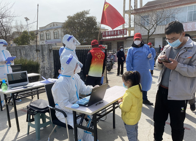 圖為黨員張根玲正在核酸檢測(cè)信息登記
