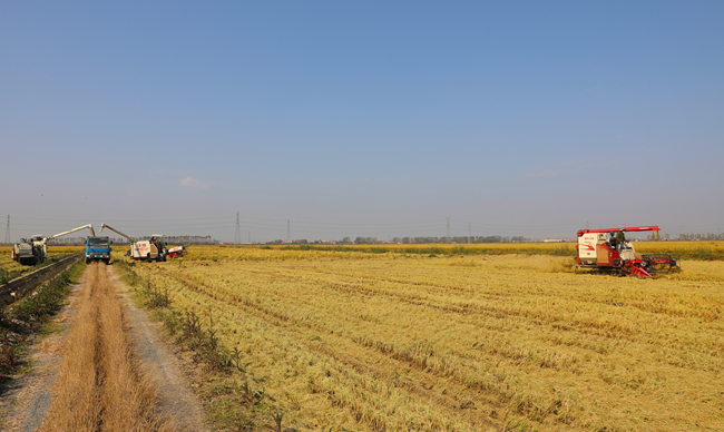 10月23日上午,在青口公司大新農(nóng)場(chǎng)萬(wàn)畝農(nóng)田里,大片水稻已經(jīng)成熟,沉甸甸的稻穗隨風(fēng)搖曳。新品種試種示范田里收割機(jī)往來(lái)馳騁,拉開(kāi)了秋收的序幕。