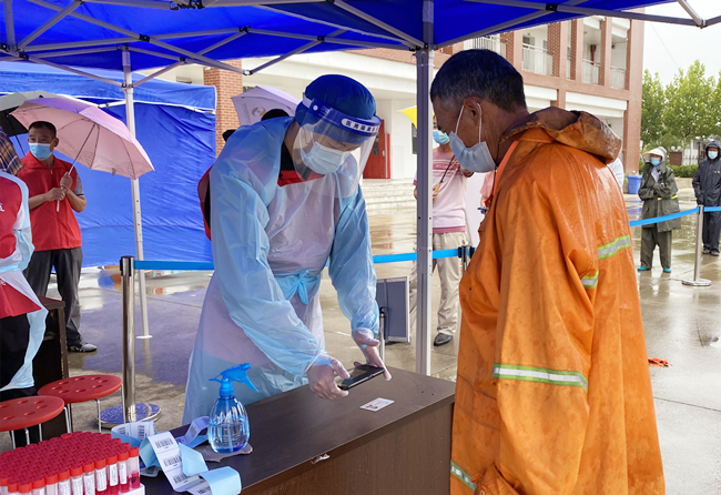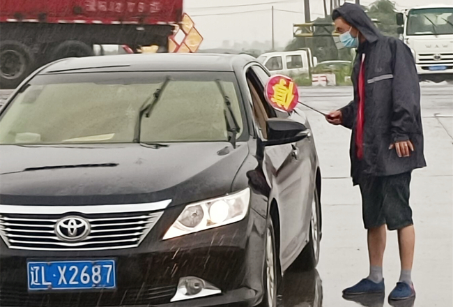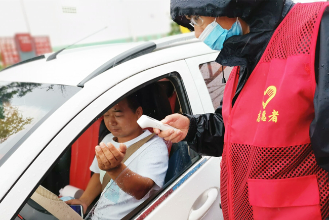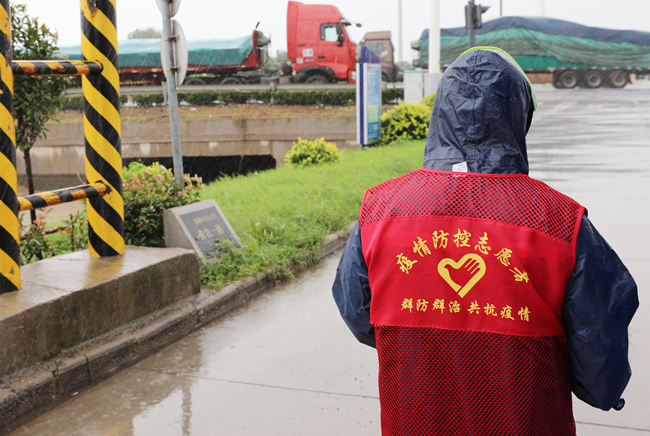 “您好,請出示一下行程碼,做下登記?!眻允卦趰徫?,逆風迎雨,對車輛進行逐一登記和體溫檢查,絲毫沒有受天氣的影響。