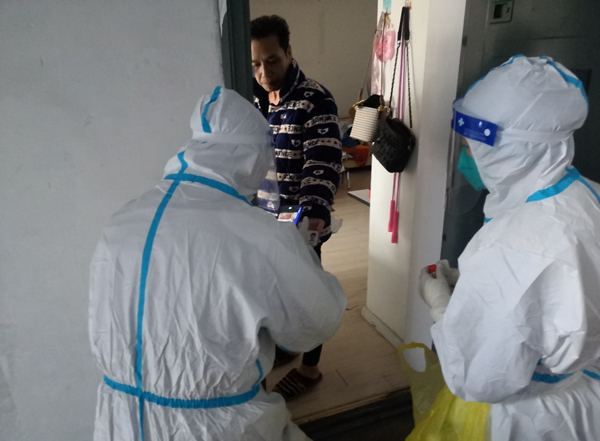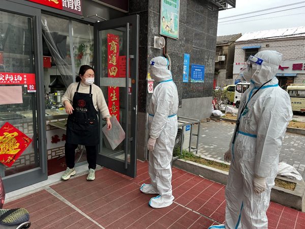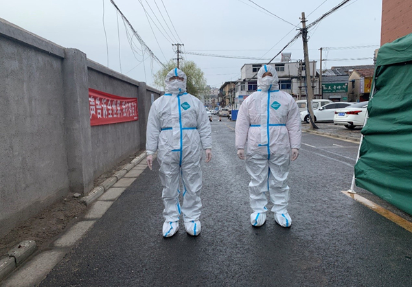 公司員工范益楊、李夢(mèng)達(dá)是集團(tuán)抗疫志愿隊(duì)的隊(duì)員。在冷冽寒風(fēng)中,他倆身穿防護(hù)服挨家挨戶通知商戶暫停營(yíng)業(yè),同樣的通知話語(yǔ)不厭其煩的重復(fù)著一遍又一遍,說(shuō)得口干舌燥、疲憊不堪也未能阻攔他們繼續(xù)前進(jìn)的腳步。