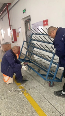 維修臺車時,我當(dāng)起了孫師傅的下手,一邊將臺車穩(wěn)住不能傾倒,一邊看著孫師傅卸下每個車輪子并進(jìn)行仔細(xì)清理,不怕臟、不怕累,毫無怨言,一絲不茍,動作利落,手法嫻熟,親身直面他的高效率和專業(yè)水平。他還對我詳細(xì)解說,讓我理解每個步驟的重要性和關(guān)鍵點。我們蔣姐也過來幫忙,不停的清掃臺車上清理出來的垃圾……