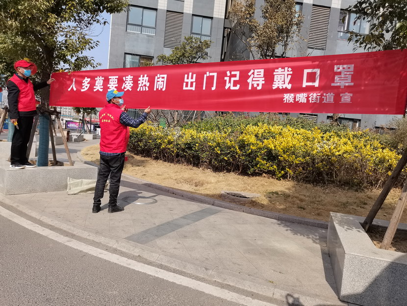▲昌圩社區(qū)臨時(shí)黨支部書記李明,黨員骨干于洪亮懸掛疫情宣傳標(biāo)語。