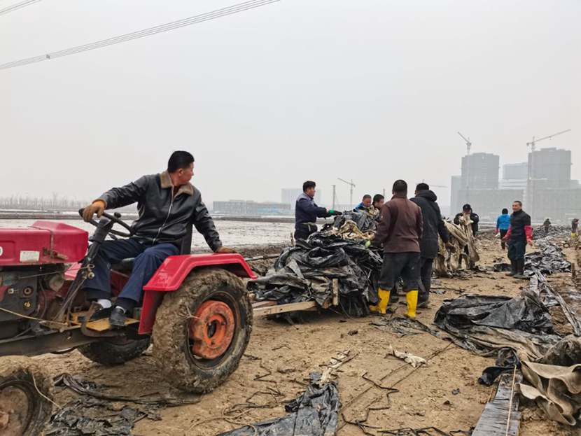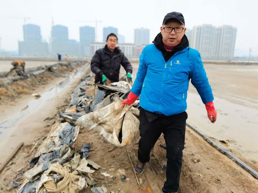 1月10日下午,第一批馳援隊伍——翔立分公司黨員突擊隊到達(dá)先鋒班組,結(jié)合海州灣公司黨員突擊隊共30余名隊員,穿戴好工作服、水鞋,兩人一組,三人一隊,雙肩挑,三人抬,緊張有序地清理生產(chǎn)現(xiàn)場拆除下來的廢棄的塑布、鋼絲等雜物。