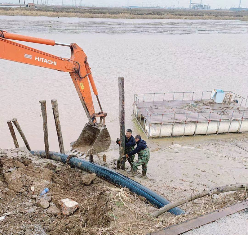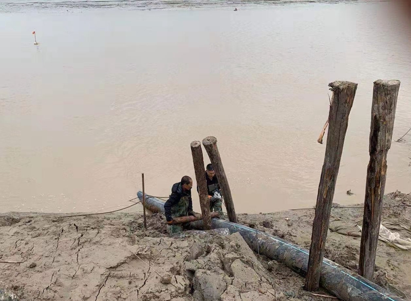 ?一想到昨天管道巡查到這里的情形,現(xiàn)在還讓人“心有余悸”!因管道地處善后河彎道處,常年的泄洪沖刮將河邊覆蓋管道的泥土沖刷卷走,使得岸邊泥土下原本穿越的PE315管道已經(jīng)暴露出來,退潮時的旋流不斷地沖撞著漂浮起來的鈣液管道,劇烈抖動著的管道不時發(fā)出“噗噗的低吼”隨時可能折斷。埒子口潮河段是鈣液東輸灌西管道最長的一節(jié)過河穿越,全長約300米。穿越管道如果折斷在河底后果將不可想象、經(jīng)濟損失也是不可估量的,這一幕讓在場所有人員都為之捏了一把汗!