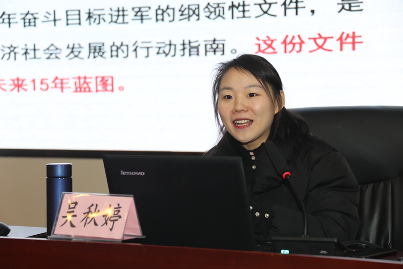 吳秋婷副主任在題為“開啟全面建設(shè)社會主義現(xiàn)代化國家新征程”報告中,從新階段與新目標(biāo)、新理念與新部署、新變化與新格局等三個方面給大家解讀了黨的十九屆五中全會精神。“新階段與新目標(biāo)”部分,介紹了我國在決勝全面建成小康社會取得的三大決定性成就,即十三五期間,全面深化改革取得重大突破;經(jīng)濟(jì)實力、科技實力、綜合國力躍上新的大臺階。在“新理念與新部署”部分,從社會發(fā)展、創(chuàng)新發(fā)展、統(tǒng)籌發(fā)展等角度分別提出了習(xí)近平總書記在新時代下對中國共產(chǎn)黨人的要求以及我國社會發(fā)展必須遵循的基本原則。在“新變化與新格局“部分,強調(diào)實現(xiàn)“十四五”規(guī)劃和2035年遠(yuǎn)景目標(biāo)意義重大、任務(wù)艱巨,但是前景光明,全黨全國各族人民要緊密團(tuán)結(jié)在以習(xí)近平同志為核心的黨中央周圍,同心同德,頑強奮斗,積極響應(yīng)十九屆五中全會對全黨全國人民的號召,奪取全面建設(shè)社會主義現(xiàn)代化國家的勝利。