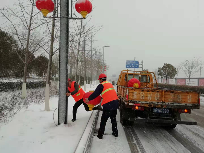 一夜的狂風暴雪將花果山大道路上的亮化燈籠刮掉不少,該項工程是翔立分公司今年承接開發(fā)區(qū)市政第一個亮化工程,安裝維護質量的好壞決定著這該項目工程的能否持續(xù)承接。帶著一份堅守、心懷責任、更帶著翔立轉型發(fā)展的希望,“鐵軍”們一大早就已經(jīng)整裝待發(fā),奔赴施工現(xiàn)場收集整理燈籠。