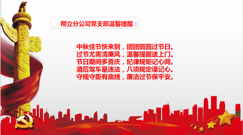 ? ? 為筑牢廉政“防火墻”,確保佳節(jié)期間風(fēng)清氣正,9月5日,翔立分公司黨支部通過微信向全體黨員干部職工發(fā)送廉潔小短信,提醒全體職工拒腐戒奢,廉潔過節(jié)。