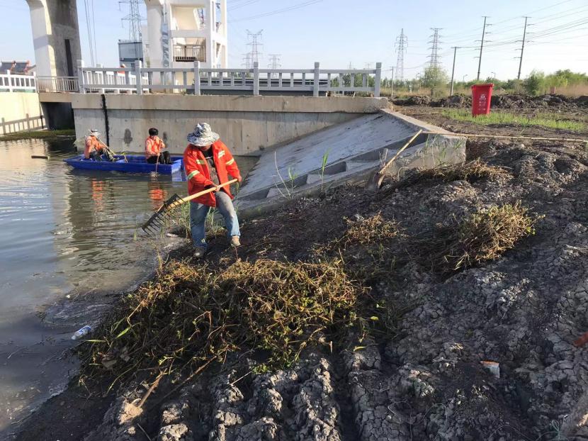 作業(yè)過程中,打撈人員因地制宜,采取分段清理、圍攔堵截、水上打撈等方式進行打撈,有的坐在船上用濾網(wǎng)、鉤耙等工具清理河面雜草,有的在岸邊將水草打撈上岸,并其進行集中處置,防止對河道造成二次污染。通過3個多小時的清理打撈,河道中的水流恢復暢通。