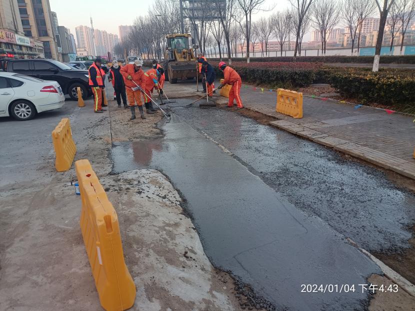 由于去年年底轄區(qū)平山路進(jìn)行電路改造,對(duì)道路路面及人行道道磚造成破壞,給行人帶來(lái)通行不便和安全隱患,為此,盛達(dá)市政公司為及時(shí)恢復(fù)行人安全出行環(huán)境,對(duì)平山路開(kāi)展整治工作。整治工作中,該公司根據(jù)工作實(shí)際情況,科學(xué)安排,精心部署,始終嚴(yán)把質(zhì)量關(guān),和天氣比賽,與時(shí)間賽跑,在供電部門完成電路改造后,第一時(shí)間進(jìn)行破損路面清除、廢舊道磚拆除、布設(shè)圍擋等清障保通工作,于今年一月初進(jìn)行測(cè)量放線、混凝土澆筑、道磚鋪設(shè)等工作,通過(guò)養(yǎng)護(hù)人員20余天的有序作業(yè),順利完成整治工作,并做好灑水覆蓋養(yǎng)護(hù)。