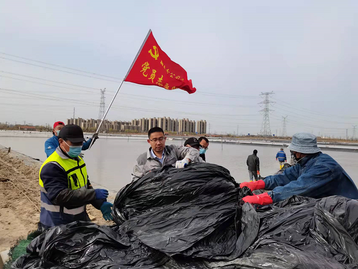生產(chǎn)現(xiàn)場(chǎng),一面面紅旗迎風(fēng)招展,先鋒班組組長(zhǎng)沈秀成駕駛拖拉機(jī),載著塑布在壟道上來回穿梭,蕩起滾滾煙塵;兩大虎將劉天義、徐勇率領(lǐng)后勤人員將塑布卸到指定單元;退休黨員朱春年帶領(lǐng)兩個(gè)小組成員蹚進(jìn)鹽池,將塑布上肩分別扛到東西堰擺放整齊;青年骨干夏軍班組成員負(fù)責(zé)塑布安裝,穿孔、打結(jié),一氣呵成。同時(shí),鹵水灌池與塑布安裝同步進(jìn)行。所有人員在各自崗位上揮汗如雨、辛勤作業(yè),忙而有序,現(xiàn)場(chǎng)呈現(xiàn)出一派熱火朝天的繁忙景象。