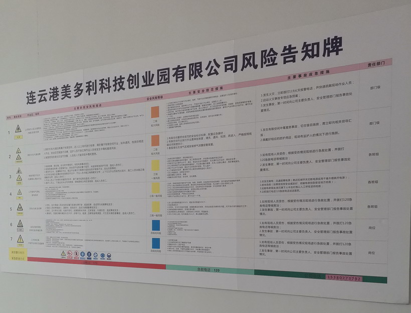 為進一步提升美多利公司安全管理水平,切實推行風(fēng)險分級管控與隱患排查治理雙重預(yù)防機制試點工作。近日來,美多利公司組織全體員工開展雙重預(yù)防機制教育培訓(xùn)。另外,對美多利公司消防泵房、特種設(shè)備等重點區(qū)域進行風(fēng)險分級管控點檢,并對各個區(qū)域張貼崗位風(fēng)險分級管控告知卡。
