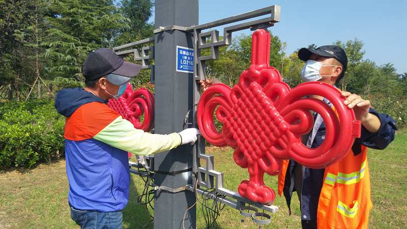 和往年一樣,今年“中秋”“國慶”兩節(jié)前夕,資源管理分公司組織公司精兵強將加入到翔立分公司兩節(jié)前道路亮化景觀突擊行動中,該公司這些志愿者隊員有的維修破損的中國結(jié)紅燈籠等亮化燈,有些負(fù)責(zé)安裝、運輸,為在節(jié)前加快完成安裝任務(wù)貢獻了自己的力量。圖為該公司志愿者在安裝自貿(mào)區(qū)主干道上的“中國結(jié)”亮化路燈。