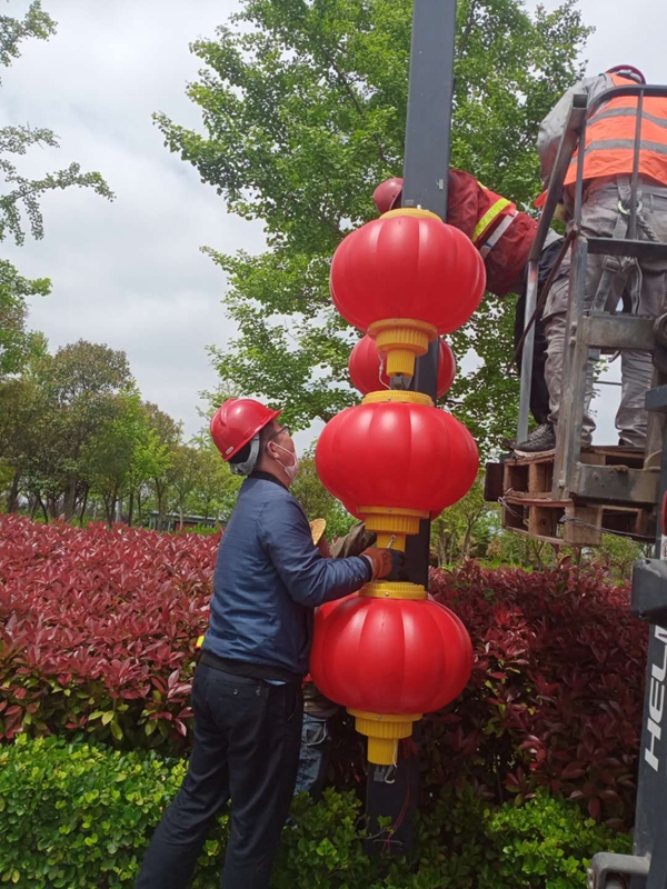 施工現(xiàn)場,大家配合默契利用小型叉車進(jìn)行輔助拆除作業(yè),五分鐘不用一個燈籠就拆除完成。這邊完成拆除部分,那邊負(fù)責(zé)還原以及運(yùn)送回收。由于燈籠的不可收攏性,同時為避免造成二次污染,對于拆下來的燈籠及時進(jìn)行運(yùn)送和回收保存,確保第二年要安裝的時候重復(fù)利用。