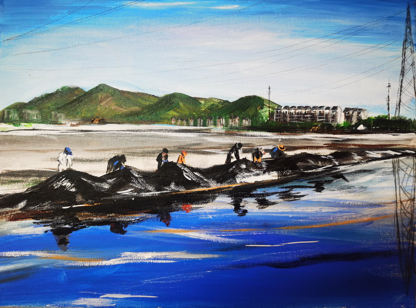 在這個屬于黨員的節(jié)日,我們脫下華麗的衣裳,全副裝備到達東灘,男同事們穿上水靴拿起鐵锨下到溝里,溝里淤泥已經(jīng)漫過了腿肚,女同事三五成群撿垃圾,抬浮板……背灼炎天光,力盡不知熱,在火熱的太陽下,我們頂著一身如雨的汗水,只為能在熱火朝天的奮斗中,給彼此一份清涼的懷念。