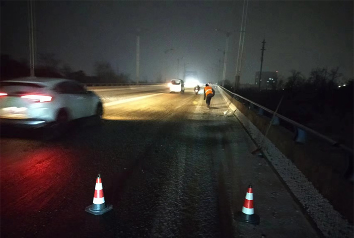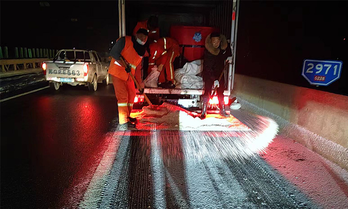 該公司除雪突擊隊由總經(jīng)理徐習(xí)華和副總王利分頭帶隊指揮,集結(jié)了安全部、管養(yǎng)部、綠化、保潔、市政、環(huán)衛(wèi)的突擊隊員80余名,出動5輛皮卡車、3輛皮卡、1臺裝載機(jī)和2輛巡查車,主要負(fù)責(zé)新區(qū)內(nèi)橋梁、連云開發(fā)區(qū)橋梁、徐新路、疏港大道、228省道等主要交通干道布撒融雪劑抗凍救災(zāi)工作。突擊隊員在進(jìn)行融雪劑撒布作業(yè)的同時,及時清理路面融化雪水,防止再次結(jié)冰,各除雪設(shè)備配合作業(yè),階梯式向前推進(jìn),提高除雪效率。(李敏 王宜全)