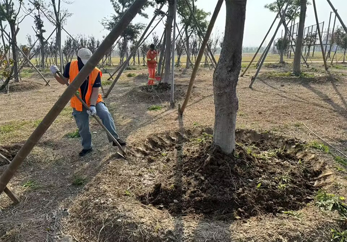 自十月中下旬以來,班組全體成員積極準(zhǔn)備,做好抗旱保障工作。每天早晨7點,兵分二路,按照各自分工迅速行動起來。葛承東帶領(lǐng)一部分工人對櫻花林、紅梅林整理樹圍;田恒亮帶領(lǐng)一部分工人施肥澆水,有的同志拎小提桶施肥,有的拿自來水管在后面澆水。為保證水流進(jìn)樹木根系,工作人員采取多種方法讓葉片、根系喝足水。為堅決打贏這場抗旱保樹木攻堅戰(zhàn),綠化分公司在堅持科學(xué)用水、節(jié)約用水的前提下,通過科學(xué)的修剪植物、抹芽,松土,除草等措施確保苗木安全度過干旱天氣。由于抗旱工作啟動較早,措施得當(dāng),抗旱保苗工作已取得初步成效。目前為止,已經(jīng)完成7000余棵櫻花林和紅梅林的施肥、澆水工作。