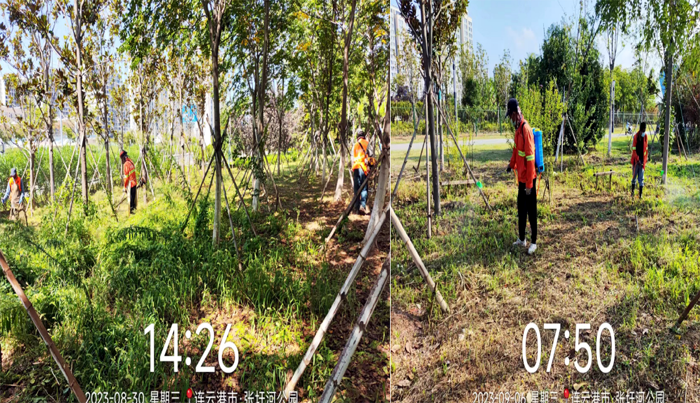 ? ? ? ?工作中,技術(shù)人員李傳武與管養(yǎng)班組長(zhǎng)班長(zhǎng)田恒亮、協(xié)管員葛承東奮戰(zhàn)在第一線,身先士卒,無懼高溫及蚊蟲叮咬,班組成員在其感染下,步調(diào)一致、步步為營,有序推進(jìn)各項(xiàng)工程進(jìn)度。經(jīng)統(tǒng)計(jì),在張圩港河公園100萬平方米草坪綠化帶上開展各類修剪10次、雜草反復(fù)清理近20次、病蟲害藥物消殺4次、新栽各類苗木600余株、清理枯死樹木300余株、對(duì)相關(guān)造型樹進(jìn)行修型。在防汛抗旱維綠工作,采取白天人工澆水搭配晚間滴灌澆水的方法,確保綠綠植健康生長(zhǎng);暴雨后扶正傾倒樹木11余株,積極排澇2次……各項(xiàng)工作數(shù)據(jù)一路“飄紅”。